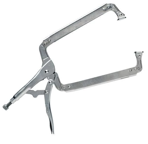 C-clamps have large throats to easily fit over awkward project pieces. A locking C-clamp also locks-down tight, and adjusts with a turn screw to produce just the right amount of clamping force; retains that adjustment for repetitive tasks. Trigger release lets you remove it quickly when its work is done. Swivel pads help give you a secure grip on tapered pieces and delicate projects without marring your work surface. Crafted of heat-treated alloy steel for a long working life.