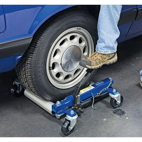 These dollies allow you to lift the wheels off the ground and move cars around, whether they run, or roll or not. Each of these hydraulic wheel dollies can lift up to 1300lbs, and work with tires up to 12 inches wide. Heavy duty ball bearing casters allow cars to be easily maneuvered around most paved and concrete surfaces. Hydraulic powered tire grab/lift action and foot pedal makes using these dollies a breeze. Set of 2.
