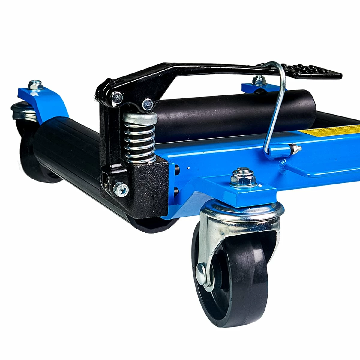 These FROST Hydraulic Vehicle Positioning Jacks / Dollies enable you to lift the wheels off the ground and move cars around with ease. Designed and solidly built frames they are a must in any Garage or Workshop where moving vehicles around is essential. Each of these hydraulic wheel dollies has a lifting capacity of 1500lbs and can accommodate tyres up to 12 inches wide. Cars can be readily handled over most paved and concrete surfaces thanks to the heavy-duty ball-bearing casters. The tyre grab/lift action is hydraulically operated, and the foot pedal makes utilising these dollies a breeze.